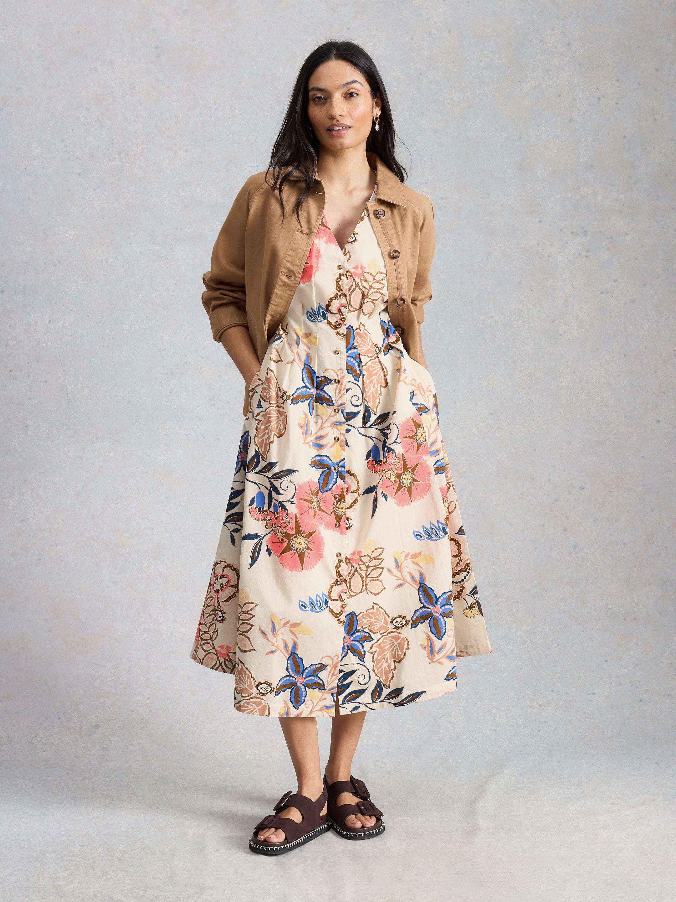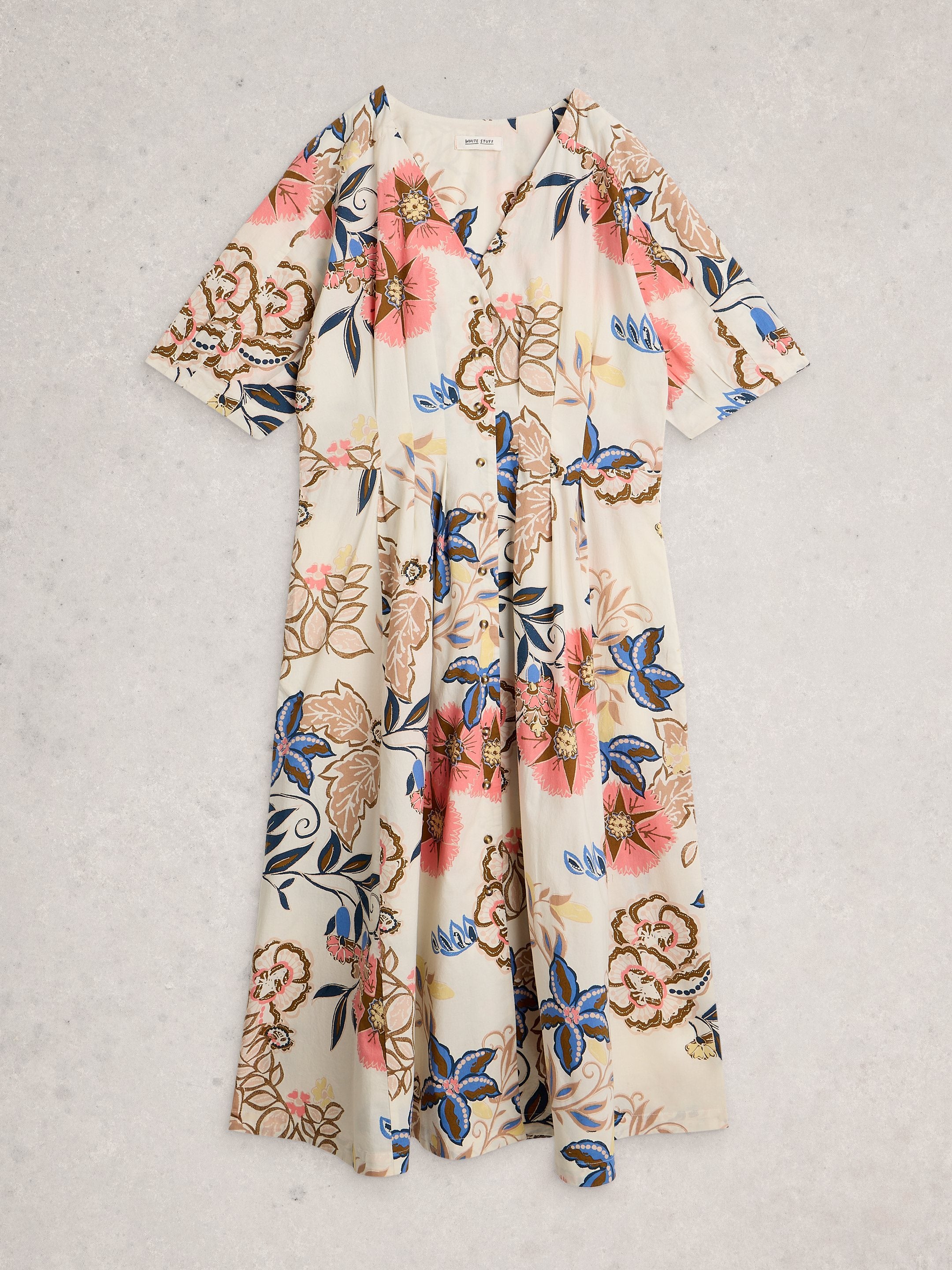 This elegant midi dress from White Stuff features a refined silhouette with strategic waist shaping and graceful pleating for a flattering figure-hugging fit. The elasticated back panel ensures comfort and flexibility throughout the day, while delicate puff sleeves add a touch of sophistication. A button-through front allows for easy styling versatility, and the included detachable cotton slip provides practical layering and opacity.