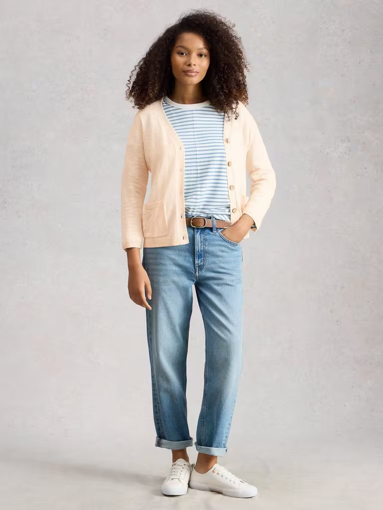Crafted from a blend of organic cotton and linen, this cardigan delivers exceptional breathability for year-round comfort. The versatile V-neckline and long sleeves create an effortlessly elegant silhouette, while practical pockets add everyday functionality. A regular fit ensures versatile styling across your wardrobe.