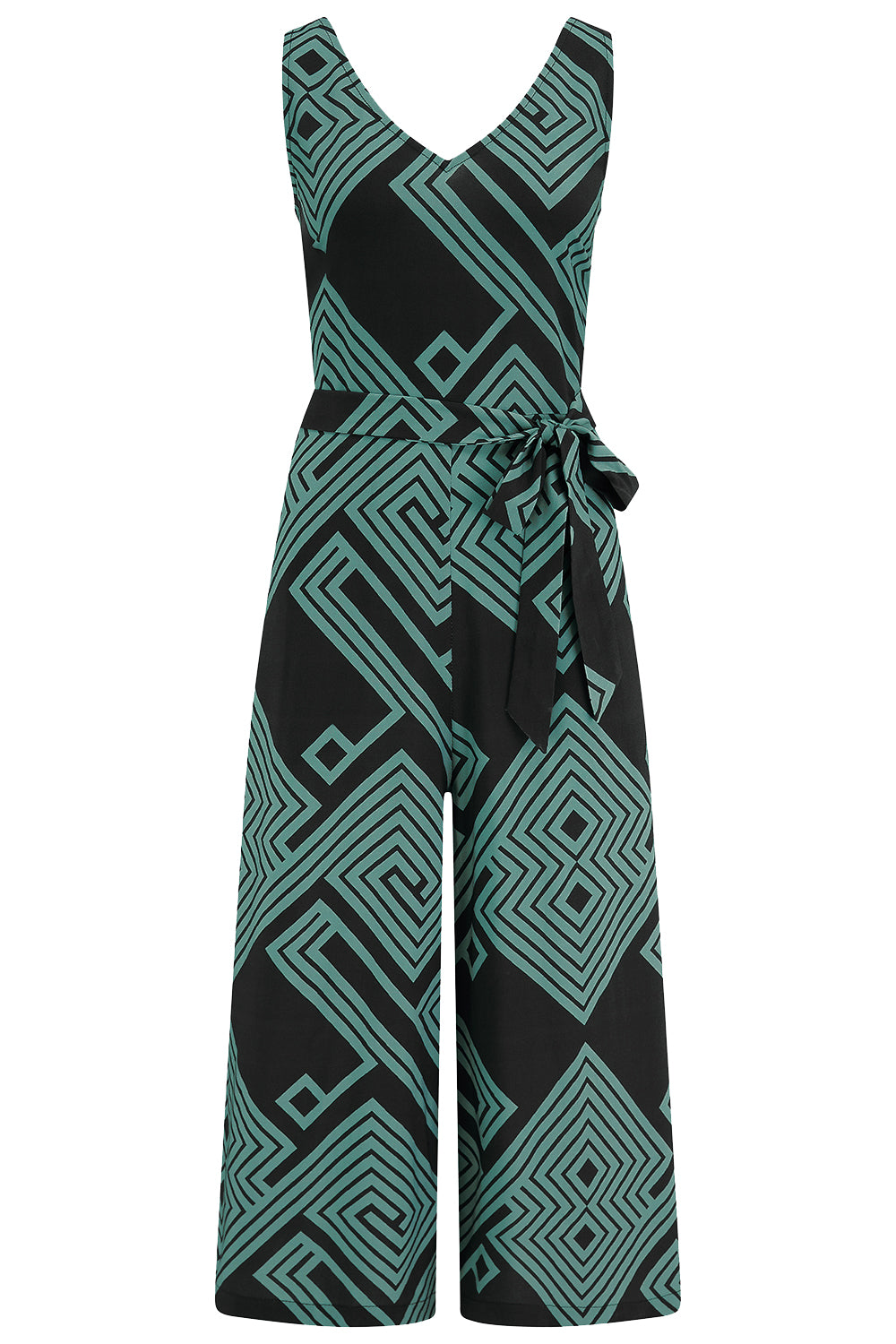Sugarhill Brighton Lamiah sleeveless jumpsuit featuring a flattering V-neckline front and back, cropped wide-leg silhouette, and practical pockets. Secured with a concealed back zip and adjustable elasticated waistband with belt tie for a customised fit.