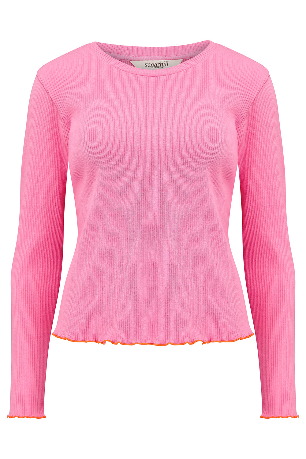 Elevate your everyday wardrobe with the Sugarhill Brighton Lena Ribbed Long Sleeve Jersey Top. This fitted essential features a classic round neckline and long sleeves finished with delicate contrasting lettuce hem and cuff detailing for a refined touch. The ribbed texture adds subtle dimension and visual interest, while the streamlined silhouette works beautifully layered or worn solo. Perfect for transitional dressing, this versatile top pairs effortlessly with jeans, skirts, or tailored trousers.