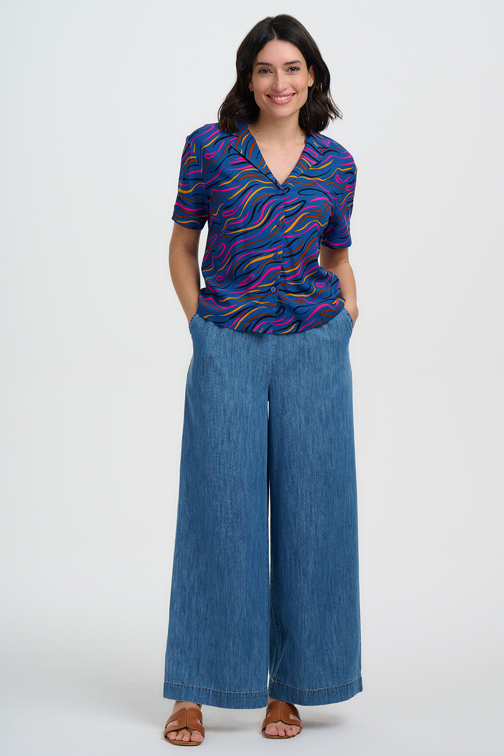 The Sugarhill Odele Shirt to sits just above the hip, short-sleeve shirt with revere collar, turned-back cuffs, and button through the front. Bright tiger-stripe waves in orange, pink, and black flowing across a deep blue background.